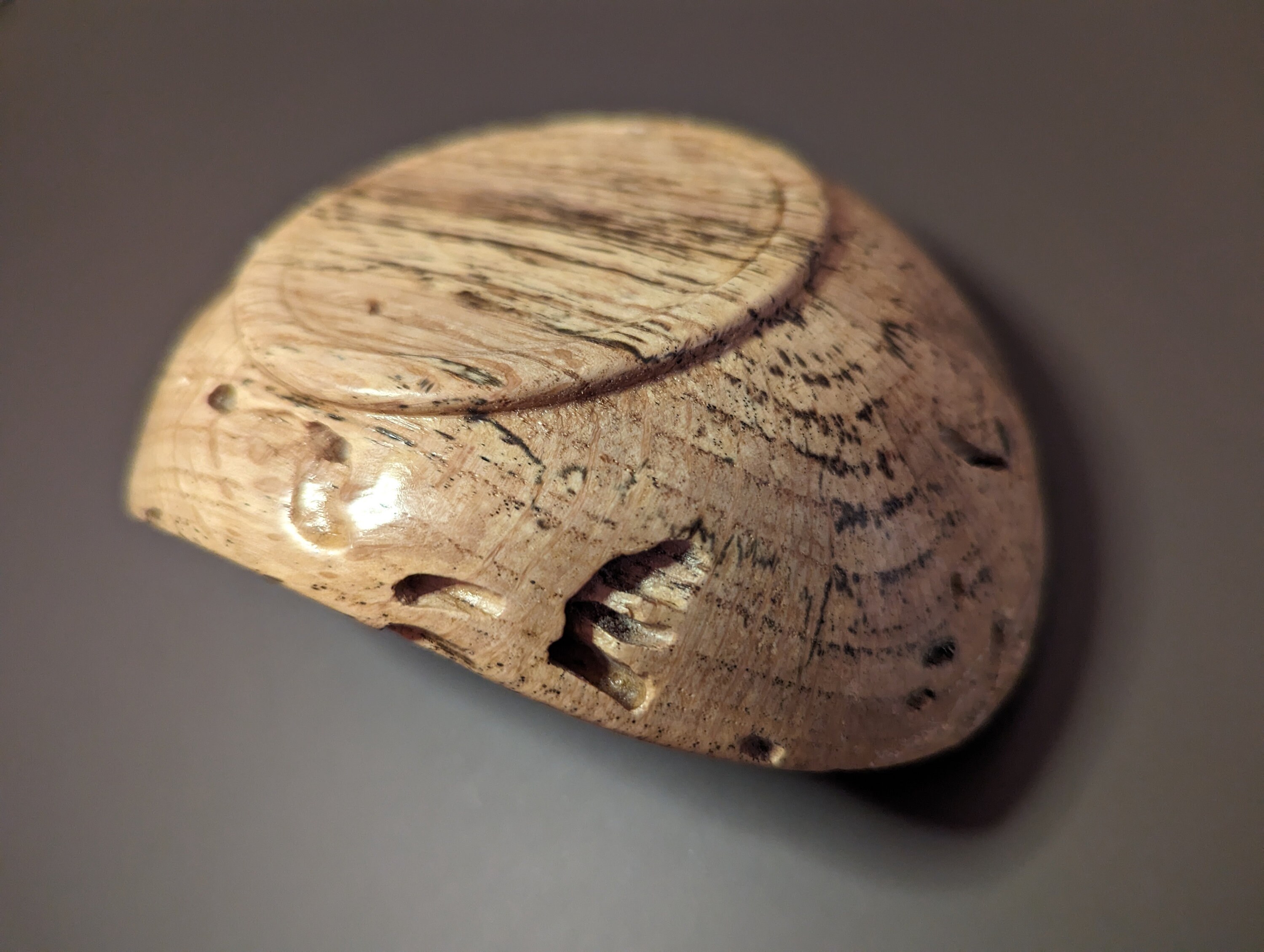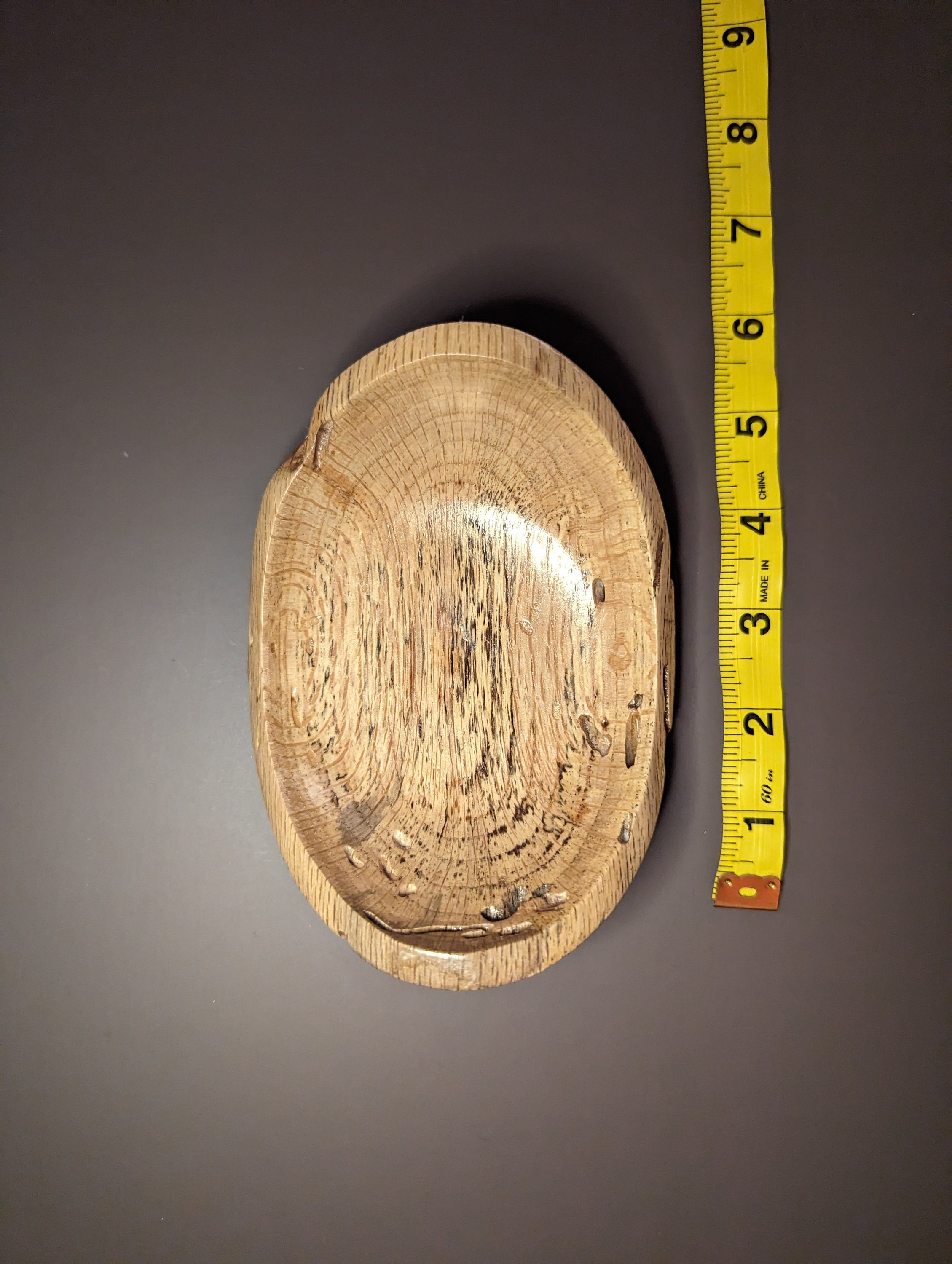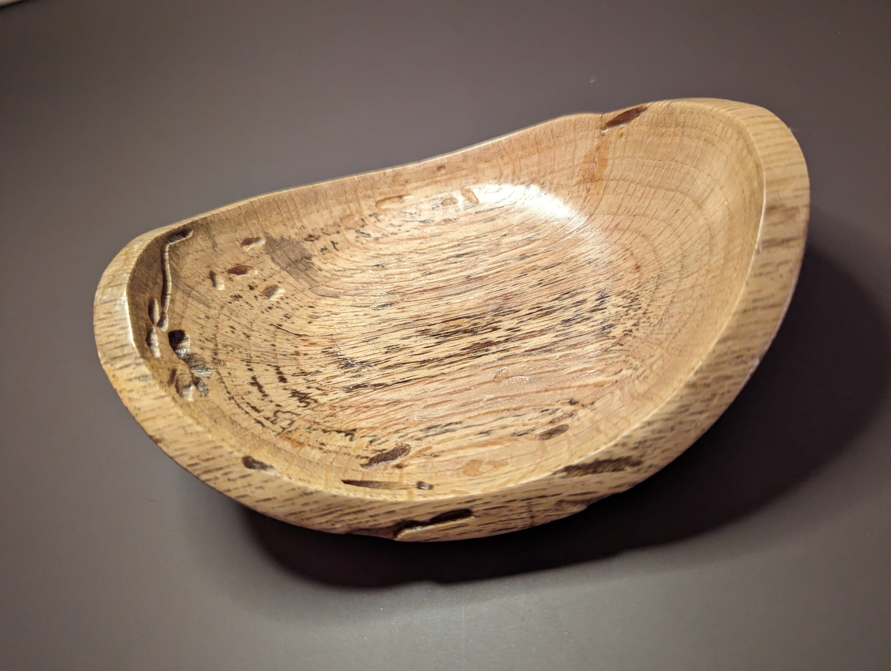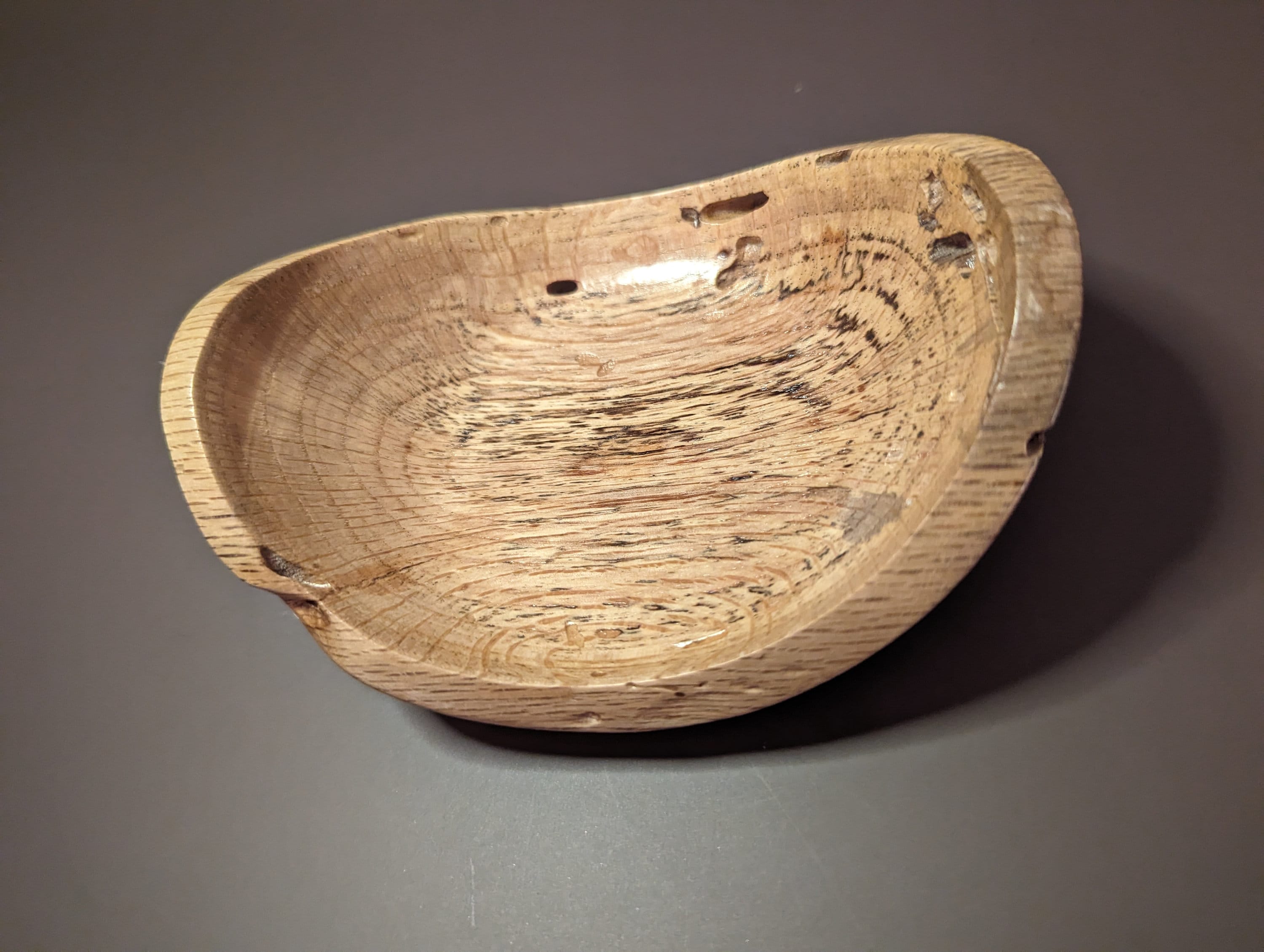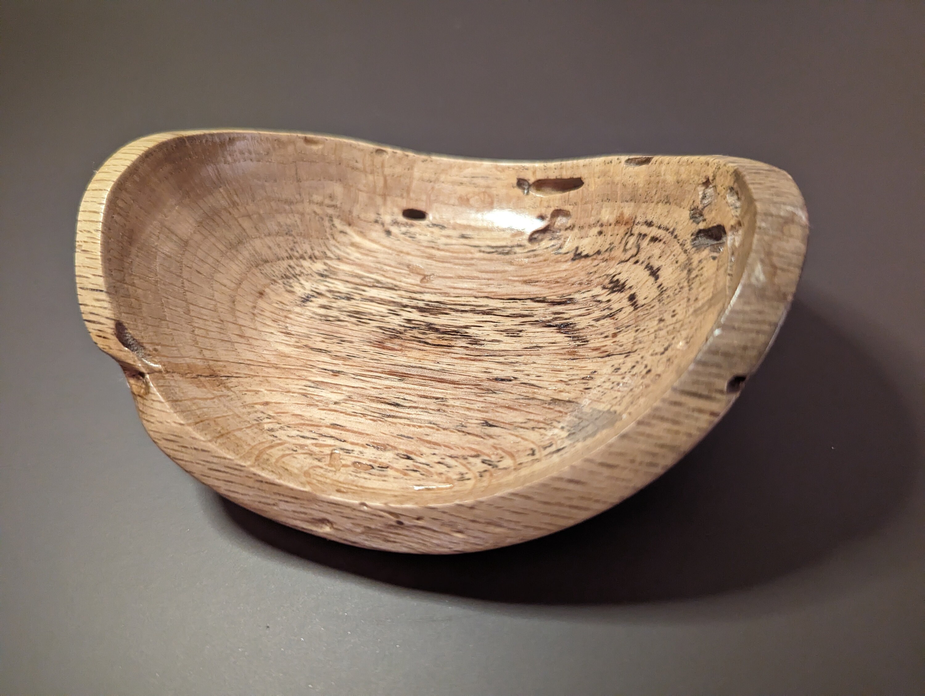 This bowl has a good amount of character from the spalted oak and wormholes from Ambrosia Beetles. I dug out all of the wood powder poop with a pick and glossed over the trails left behind heavily with shellac.